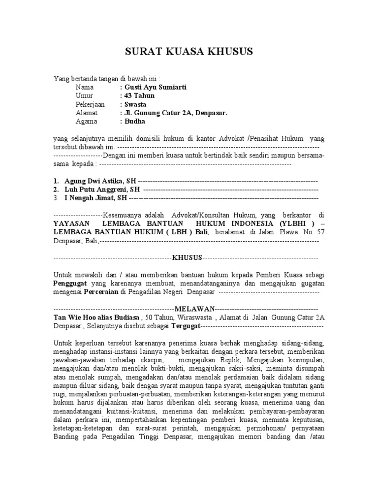 Singkawang, 6 mei 1966 pekerjaan : Surat tersebut berguna untuk membuktikan jika penerima kuasa berhak untuk mengatasnamakan pemberi. Surat kuasa khusus meliputi kegiatan tertentu yang dialihkan ke penerima kuasa. Contoh surat kuasa khusus perceraian yang sah sebagai referensi dalam membuat surat kuasa khusus yang baik dan benar dengan format yang resmi. Semoga surat ini dapat digunakan dengan.
